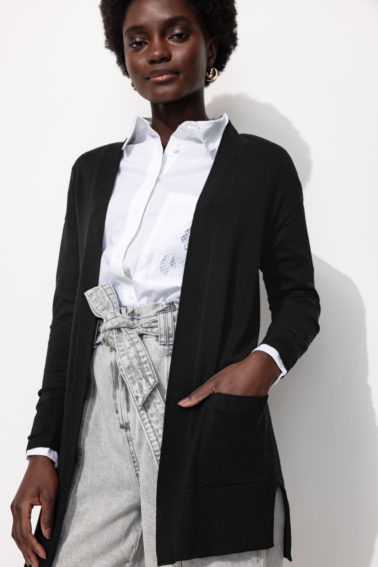 Lang, soft und zeitlos. Fürs Büro, zu Hause am Wochenende: dieser lange Cardigan rundet modisch jeden Look ab. Das Modell aus weicher Feinstrickmasche ist gerade geschnitten mit langem Arm, 2 aufgesetzten Taschen, geradem Saum mit Schlitzen und Rippbündchen. Wird offen getragen. Enthält Viskose aus Zellstoff aus nachhaltiger Forstwirtschaft.