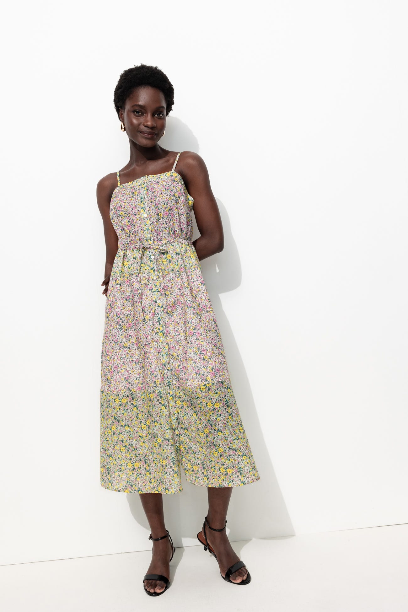 Frische Blüten und Sommerlaune... genießen Sie die Sonne in diesem leichten gefütterten Kleid! Das Modell in Midilänge mit schmalen verstellbaren Trägern und Elastikeinsatz im Rücken ist unter der hohen Taille ausgestellt geschnitten mit durchgehender Knopfleiste. Enthält 100 % Baumwolle aus biologischem Anbau, die ohne Pestizide, Kunstdünger oder Gentechnologie angebaut wird.
