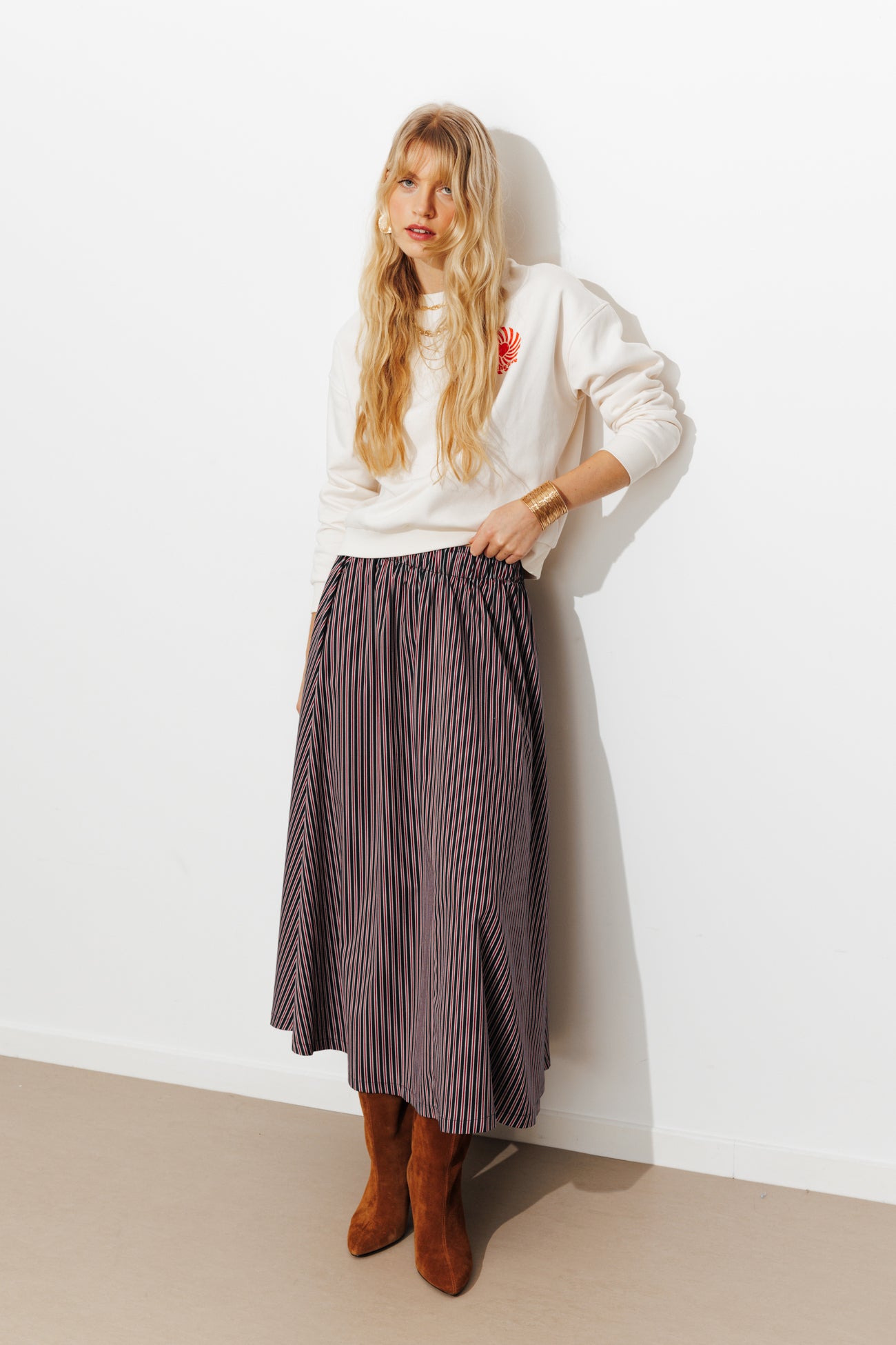 Ultra-moderner Urban style mit Oversize-Volumen: hier kommt der lange weite gestreifte Rock! Tragen Sie ihn mühelos zu jeder Jahreszeit, ob mit oder ohne Strumpfhose, zu Boots, Sneakers, Sabots oder Sandalen... Das Modell aus softem, schön fallendem Canvas hat eine gesmokt-elastische Taille, 2 Eingrifftaschen und einen abgerundeten Saum. Enthält recycelte Fasern.