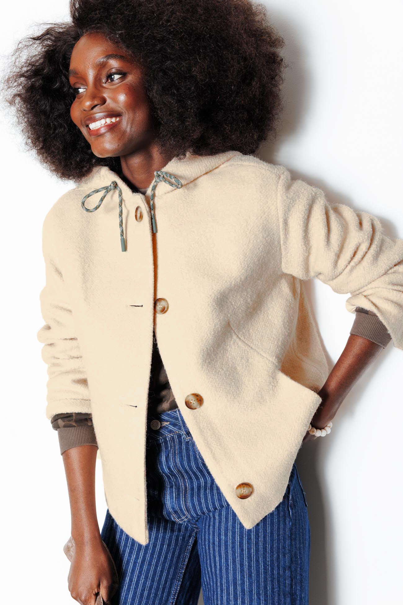 Schwungvoller College-Style! Ob Sie die Kapuze anziehen oder nicht, in diesem Kurzmantel sind Sie stets ultra-modisch gekleidet. Das Modell in Bouclé-Optik ist gerade und kurz geschnitten mit Kordelzug an der Kapuze, Knopfleiste vorn, 2 Eingrifftaschen vorn, langem Arm, leicht abgerundetem Saum und Innenfutter. Enthält recycelte Fasern.