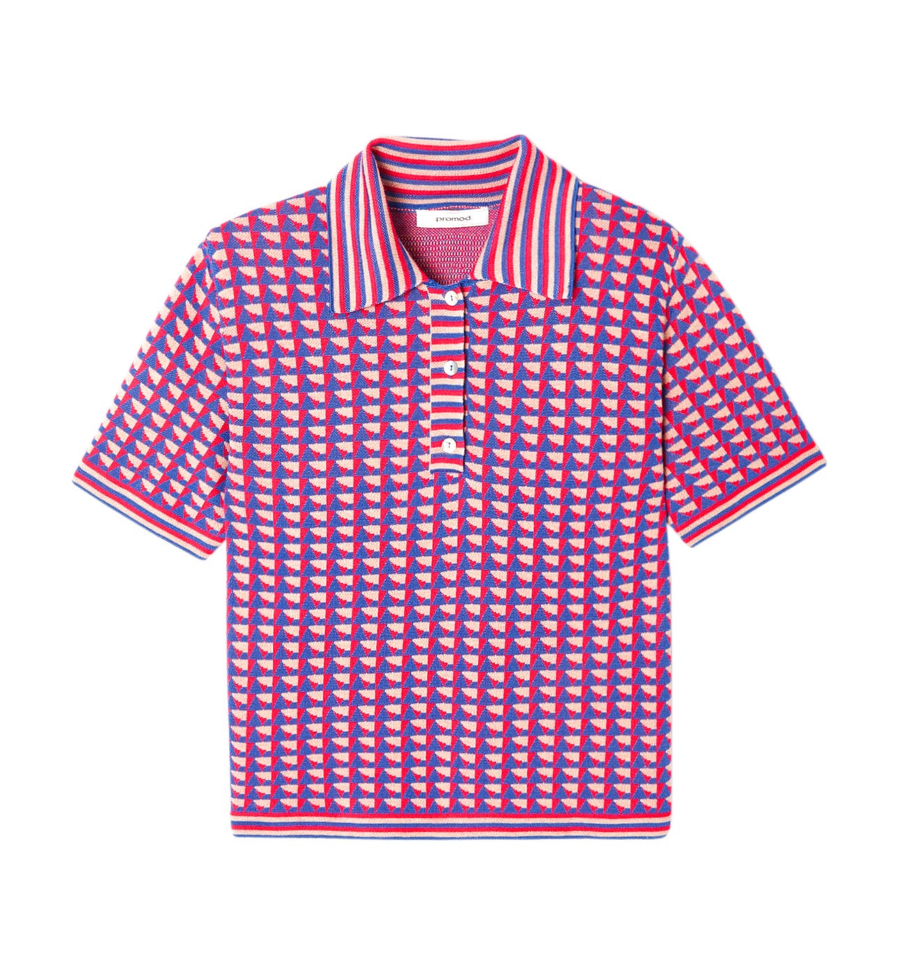 Surfen Sie auf der Retro-Welle! Dieser Pullover mit Polokragen schmückt sich mit bunten Jacquardmustern. Wir lieben den leicht seidigen Look und die tolle Passform der engen und weichen Strickmasche. Kombiniert oder im Total Look ein Hingucker! Das Modell ist gerade geschnitten mit geknöpftem Polokragen (Knöpfe in Perlmutt-Optik) und kurzem Arm., der Kragen und die Abschlüsse sind gestreift.