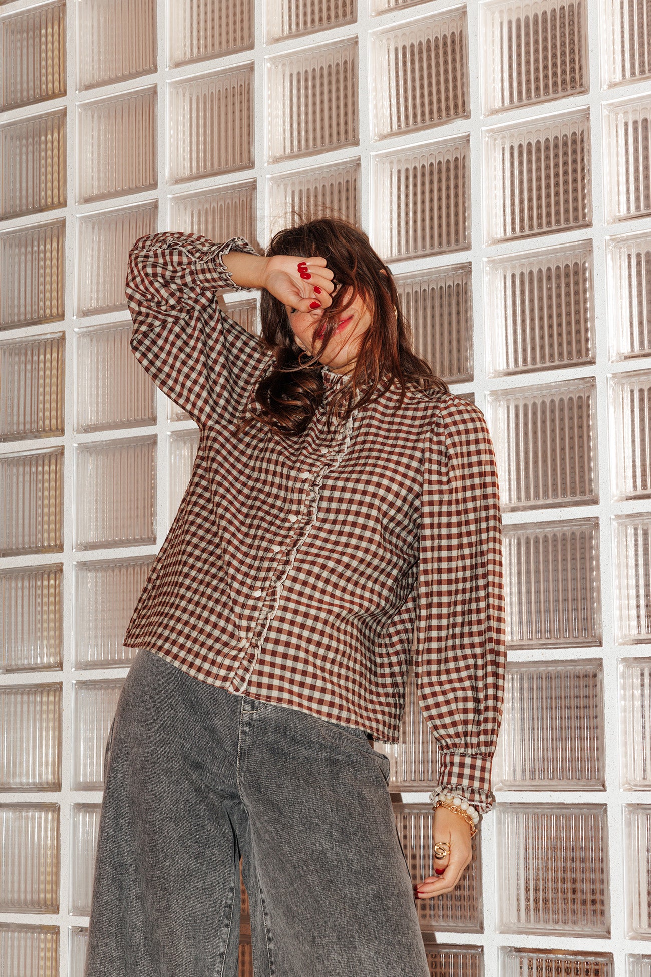 Volanthemd mit Vichykaros - Kastanienbraun kariert