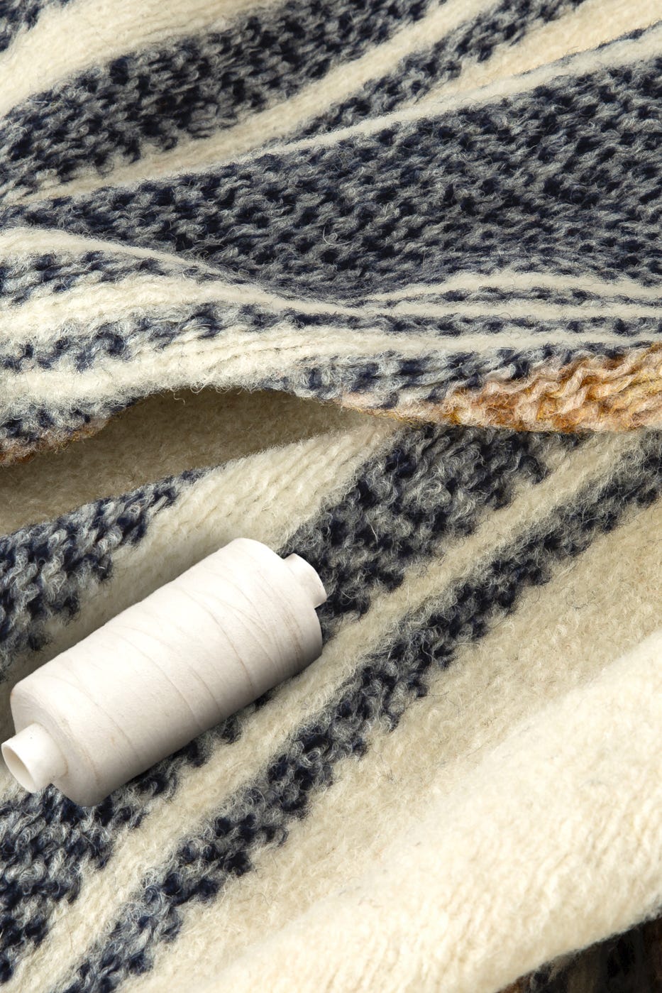Dieser Zuschnitt besteht aus einem Mischgewebe mit 63 % Wollanteil, er ist ideal für eine Jacke, einen Poncho oder einen Mantel. Der Tipp der Stylistin: wir lieben den englischen Charme dieses gestreiften Stoffs.